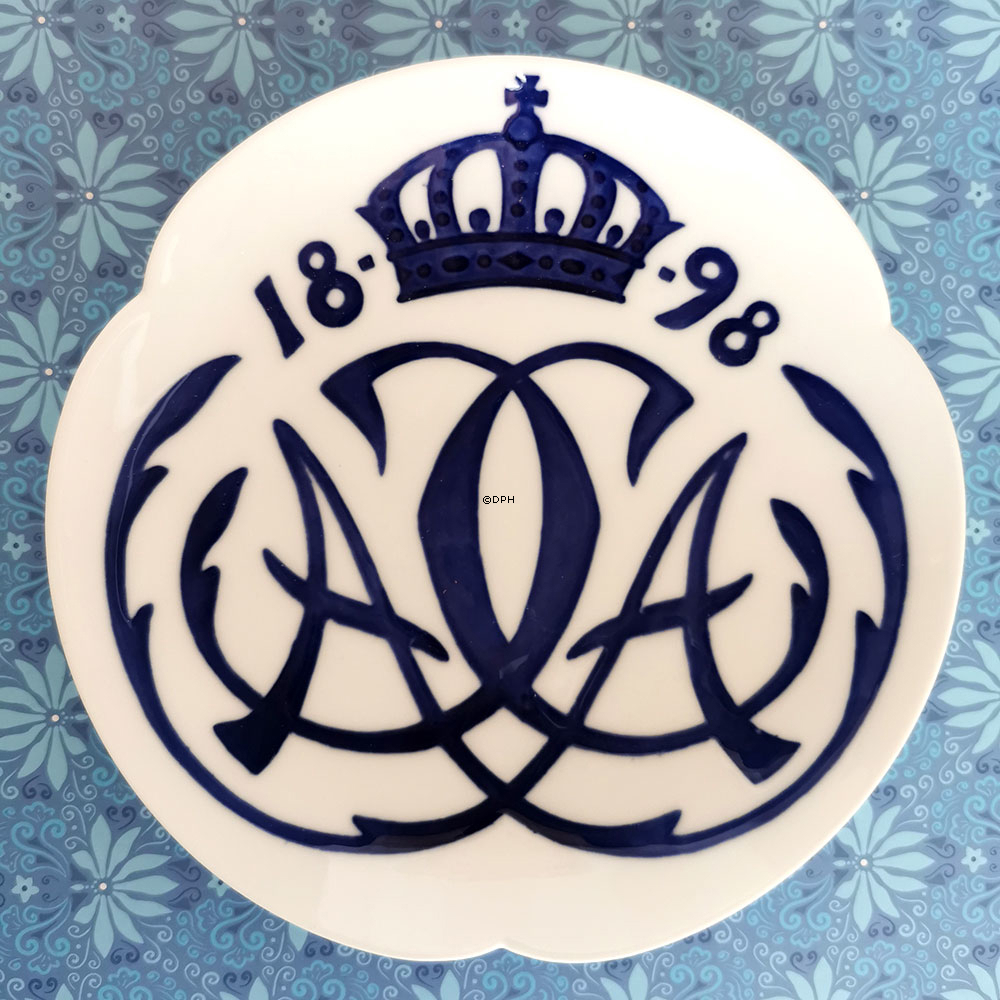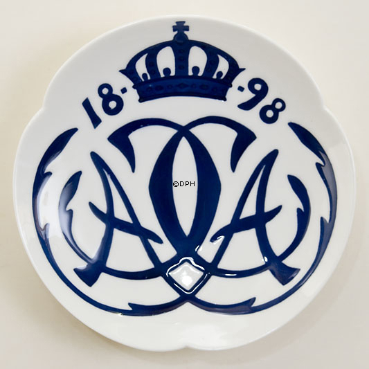 Royal Copenhagen Gedenkteller Ausgabejahr: 1898 2500 Exemplare Entwurf: Arnold Krog Durchmesser: 6 3/4 " Motiv: Die Hochzeit von Prinz Christian (später König Christian X) mit Prinzessin Alexandrine von Mecklenburg. Die Kante ist in drei Kurven geformt. Krone und das Jahr 1898 unter dem Monogramm CA.