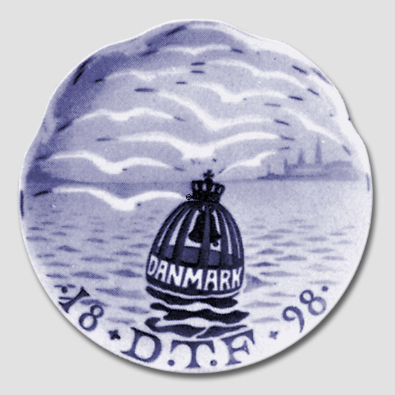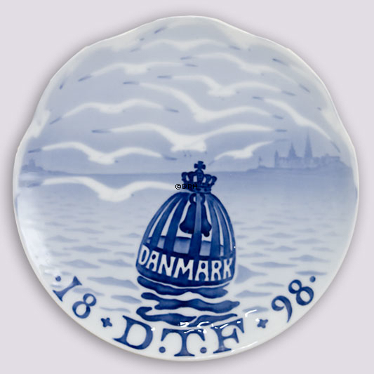Royal Copenhagen Gedenkteller Ausgabejahr: 1898 800 Exemplare Entworfen von: Arnold Krog Durchmesser: 7 1/4 " Motiv: Gekrönte Navigationsboje mit der Inschrift DANMARK, die sich außerhalb des Schlosses Helsingør mit Möwen in der Luft befindet. Inschrift: 18 DTF 98 (Dänischer Tourismusverein). in Auftrag gegeben von dieser Vereinigung.