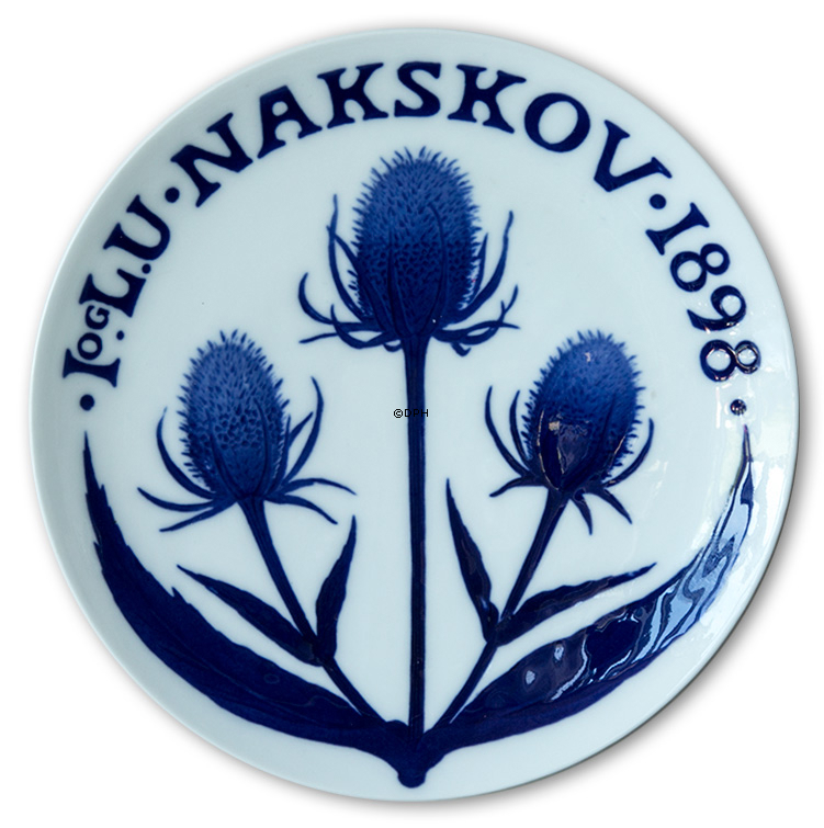 Royal Copenhagen Gedenkteller Ausgabejahr: 1898 500 Exemplare hergestellt Entworfen von: Arnold Krog Durchmesser: 7 3/4 cm Motiv: Blumenmotiv mit Inschrift i. og LU NAKSKOV 1898 (Industrie- und Landwirtschaftsausstellung in Nakskov). in Auftrag gegeben von der Ausstellung.