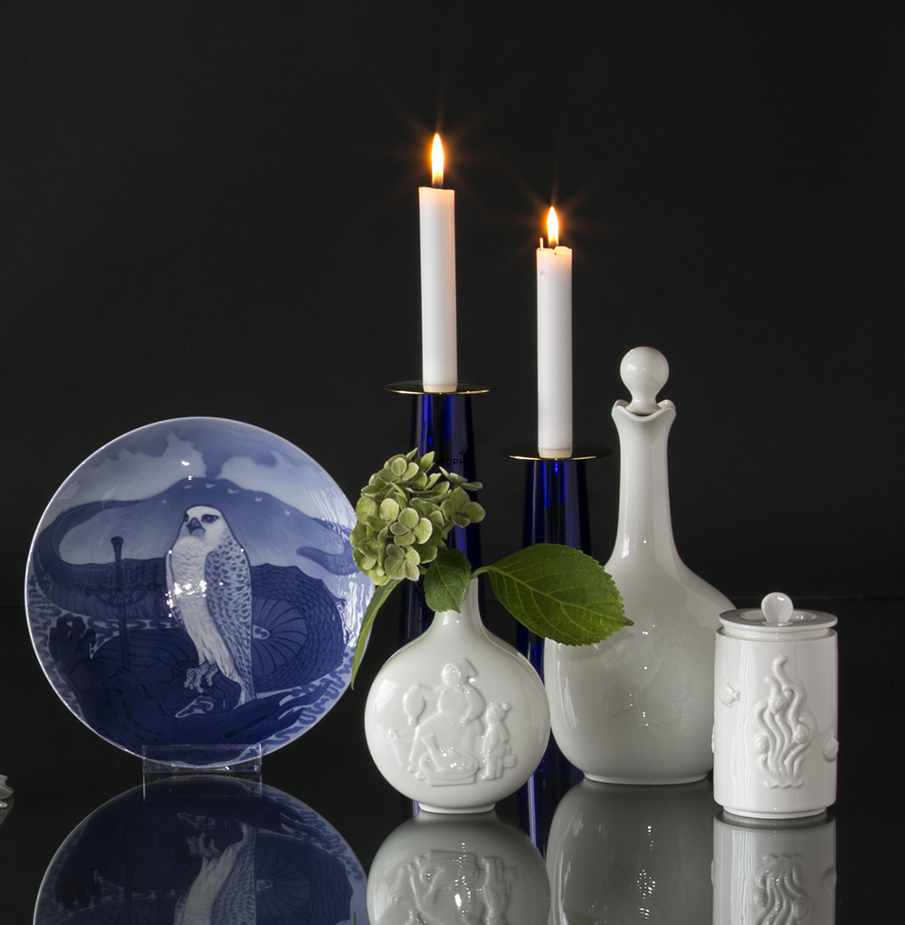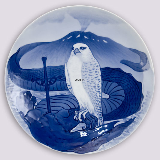 Royal Copenhagen Gedenkteller Ausgabejahr: 1898 2500 Exemplare Entwurf: Arnold Krog Durchmesser: 8½ "cm Motiv: Isländischer Falke auf einem von einem Rapier durchstoßenen Drachen. in Auftrag gegeben von der unabhängigen Odd Fellows für ihr Krankenhaus auf Island.