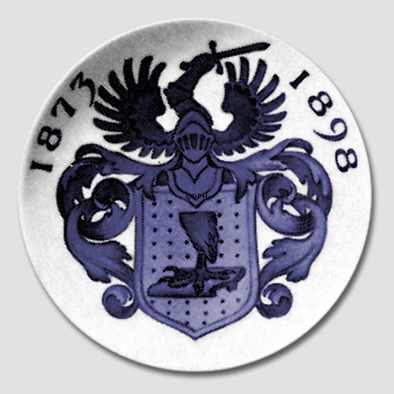 Royal Copenhagen Gedenkteller Ausgabejahr: 1898 600 Exemplare hergestellt Durchmesser: 6 3/4 " Motiv: Wappen. Im Schild ein Adlerfuß, auf dem Helm bewaffnete Hand zwischen zwei Adlerflügeln. Inschrift: 1873-1898. in Auftrag gegeben von den Weinhändlern I. C. Teilmann anlässlich ihres 25-jährigen Jubiläums.