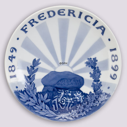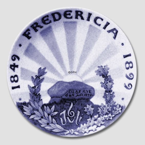 Royal Copenhagen Gedenkteller Ausgabejahr: 1899 1000 Exemplare hergestellt Entworfen von: Arnold Krog Durchmesser: 6 3/4 " Motiv: Bolmen und aufstehende Sonne. Inschrift: 1849 - FREDERICIA - 1890 6. JULI. Auf dem Dolmen OLAF RYE D. 6. Juli 1849. Gedenkteller für den 50. Jahrestag der Schlacht von Fredericia 6. Juli 1849 und für den General Olaf Rye, der in der Schlacht starb.