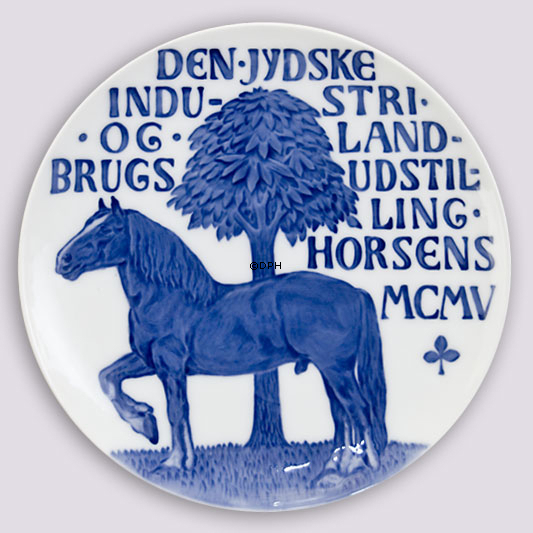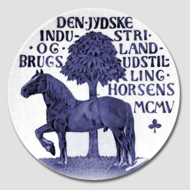 Royal Copenhagen Gedenkteller Ausgabejahr: 1905 Unbekannte Anzahl Exemplare Entwurf: Arnold Krog Durchmesser: 7 3/4 " Motiv: Hengst steht vor einem Baum. Inschrift: DEN JYDSKE INDUSTRI- OG LANDBRUGS-UDSTILLING HORSENS MCMV (Industrie- und Landwirtschaftsausstellung für Jütland in Horsens).