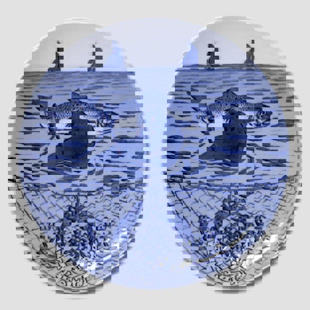 Royal Copenhagen Gedenkteller Ausgabejahr: 1905 666 Exemplare hergestellt Entworfen von: Arnold Krog Durchmesser: 7 3/4 " Motiv: Siegel mit einem Lachs im Maul. Im Hintergrund Segelboote. Unterhalb eines Fischernetzes mit Lorbeerkranz und Inschrift: xx AARSMØDE 1905, Monogramm FF (Fischereiverein) und gekrönte Initialen V und M (Fürst Valdemar und Prinzessin Marie, Protektoren der Fischereiausstellung). In Auftrag gegeben vom Verein.