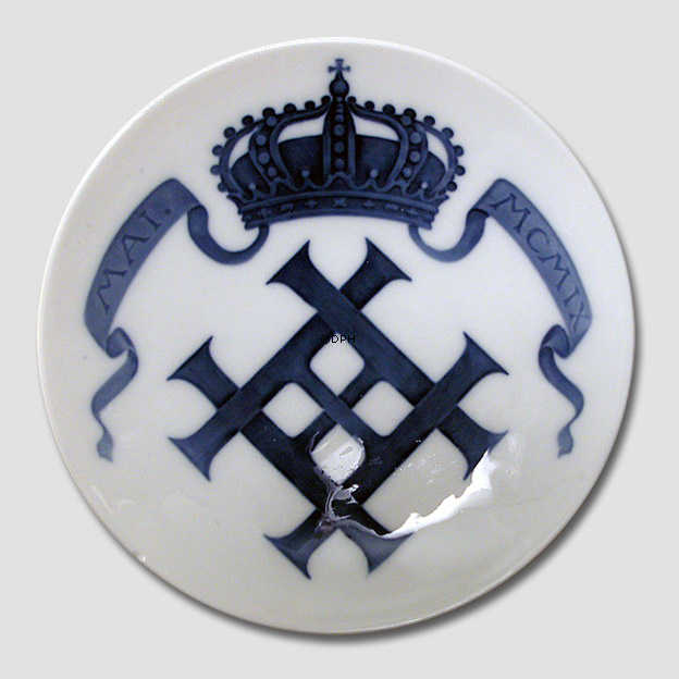 Royal Copenhagen Gedenkteller Ausgabejahr: 1909 1653 Exemplare Entwurf: Arnold Krog Durchmesser: 6 3/4 " Motiv: Die Hochzeit von Prinz Harald von Dänemark mit Prinzessin Helena von Slesvig-Holsten-Sønderborg-Glücksborg. Gekröntes Monogramm HH und Band mit Inschrift: MAI MCMIX.