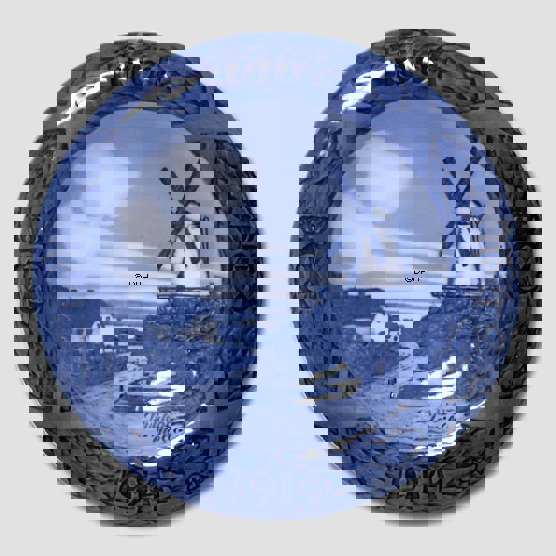 Royal Copenhagen Gedenkteller Ausgabejahr: 1914 2814 Exemplare hergestellt Entworfen von: Arnold Krog Durchmesser: 7 3/4 " Motiv: Die Düppeler Mühle mit Lorbeerkranzrand. Inschrift: 1864-1914 C IX und CX (die Könige Christian IX und Christian X). Anläßlich des fünfjährigen Jubiläums der Schlacht bei Duppeler (Dänemark v. Deutschland).