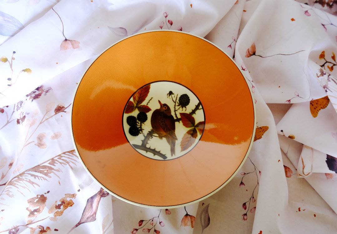 Aluminia Gunhild Fayence Obstschale oder Obstteller mit Amsel auf Brombeerzweig.