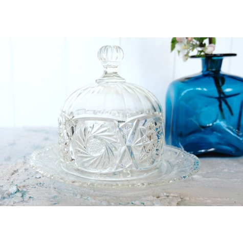 Sehr schöne Käseglocke aus Glas mit schönen geschliffenen Dekorationen sowohl auf dem Fuß als auch auf der Glocke. Der Durchmesser des Fußes beträgt 23 cm und der Durchmesser der Glocke beträgt 14 cm