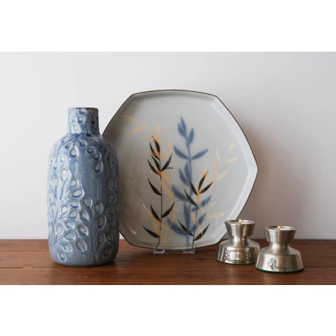 Dekorative Keramikvase mit Muster. Blau mit Nuancen von Beige um das Muster herum.