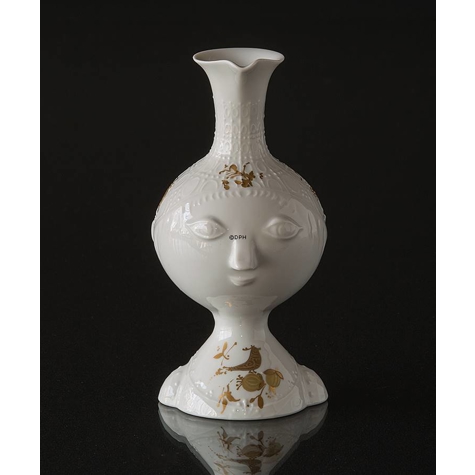 Die Vase ist 15cm groß und zeigt die typische Bjørn Wiinblad Frauenfigur. Der Krug ist aus weißem Porzellan mit goldenen Markierungen.