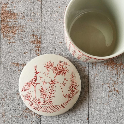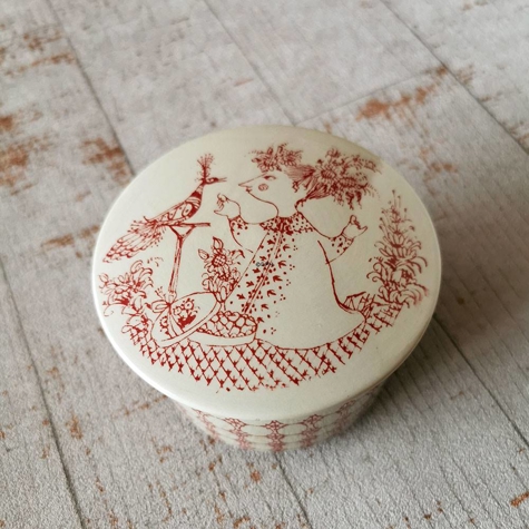Wiinblad Dose mit Deckel, verziert mit dem charmanten "Praline"-Motiv, ist ein exquisites Sammlerstück für alle, die Bjørn Wiinblads einzigartigen Stil schätzen. Diese rote Dose (Nr. 3177-338) zeigt eine detaillierte Strichzeichnung einer anmutigen Frau und eines prachtvollen Pfaus, beide in Wiinblads charakteristischem fantasievollen Ausdruck gerahmt. Die Figur ist mit feinen Details versehen, die das Dekor lebendig werden lassen und jedem Raum eine romantische und künstlerische Atmosphäre verleihen.