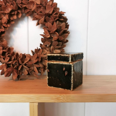 Kleine, eckige Deckeldose aus glasiertem Steinzeug von der international anerkannten dänischen Keramikerin Gunhild Aaberg. Die warme braune Grundfarbe der Dose ist elegant mit tiefen, warmen Braun- und Grüntönen geschmückt, die als feine,