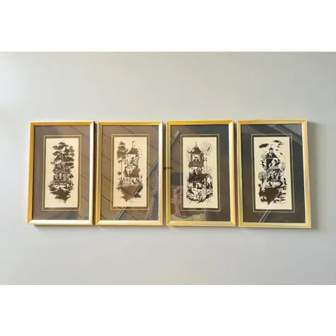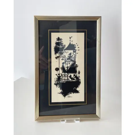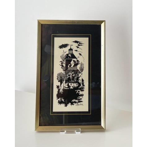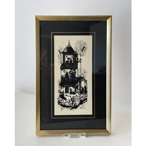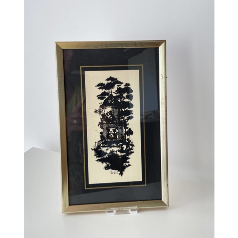 Schwarzes Motiv auf weißlichem/gilblichem Papier, gerahmt in Goldrahmen mit Patina.